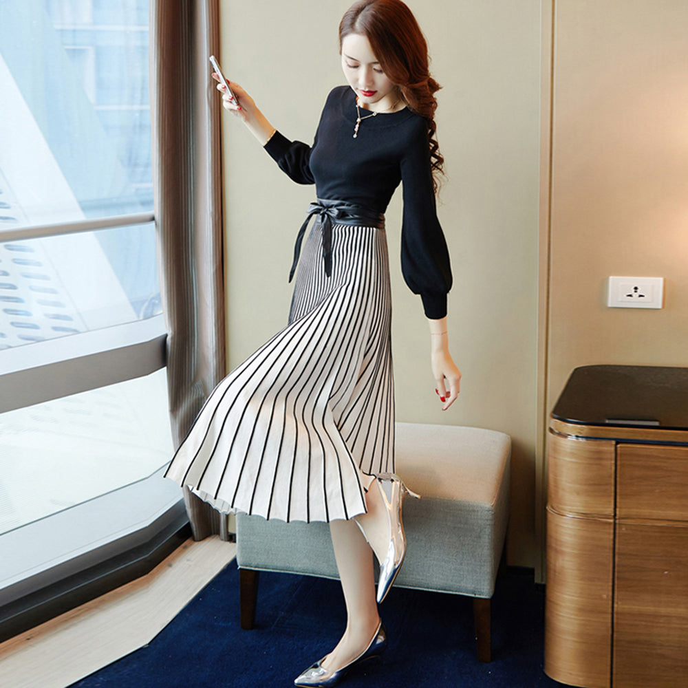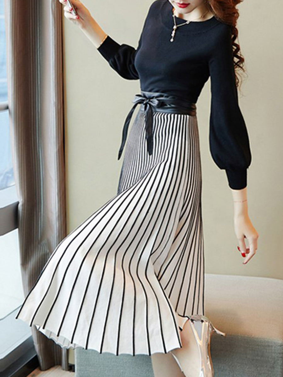7分袖丸ネックミモレ丈 ハイウェストAラインワンピース